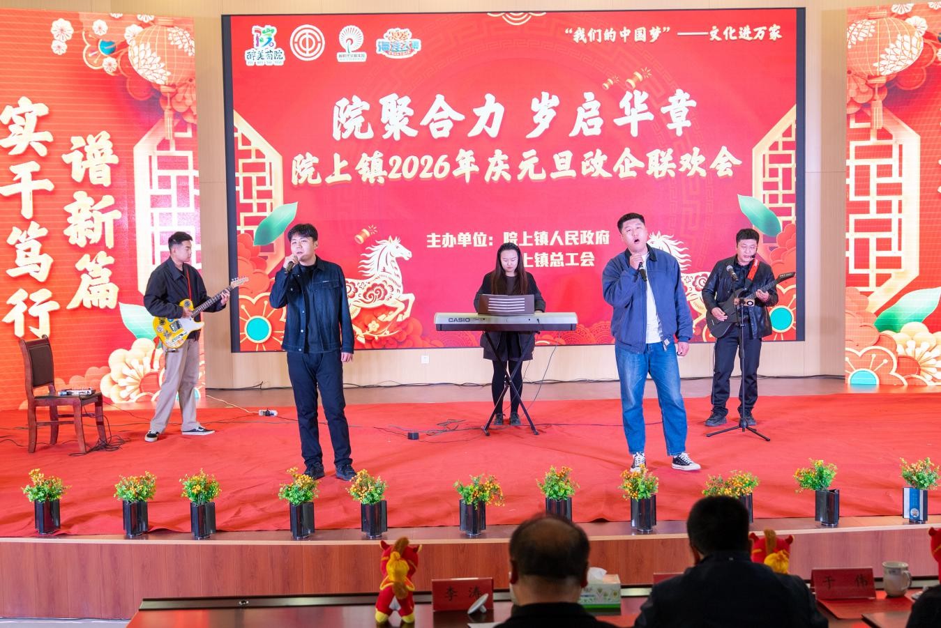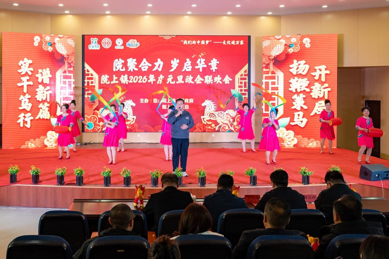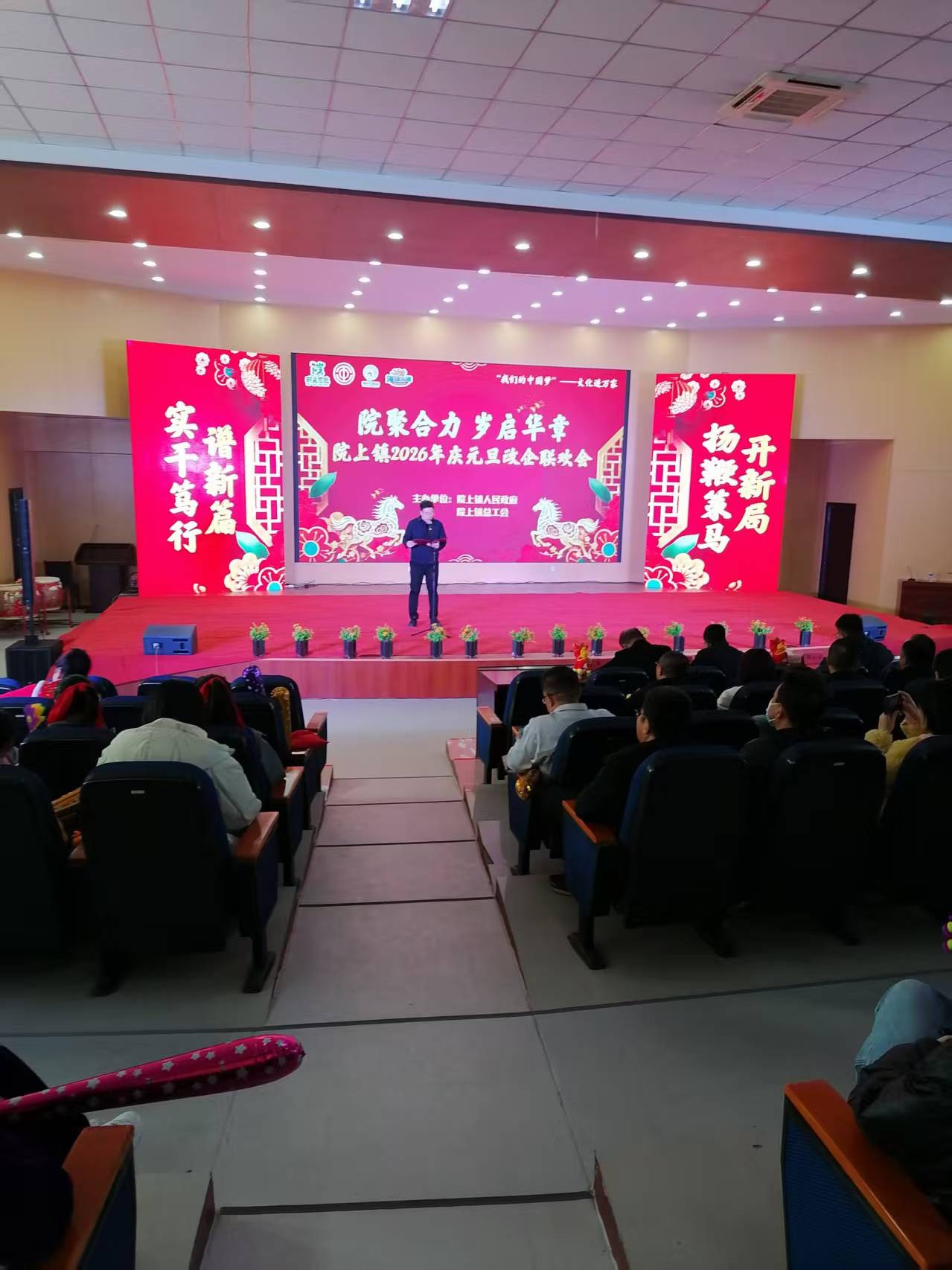 2025年12月30日,莱西市院上镇政府礼堂张灯结彩、暖意融融,处处洋溢着喜庆祥和的节日氛围。由院上镇人民政府主办的2026年元旦政企联欢会在此隆重举行,院上镇党委书记于伟及班子成员、机关干部和企业代表齐聚一堂,载歌载舞欢庆过往一年的丰硕佳绩,共迎元旦新春的到来,凝聚共识、蓄势待发,携手再创新辉煌。