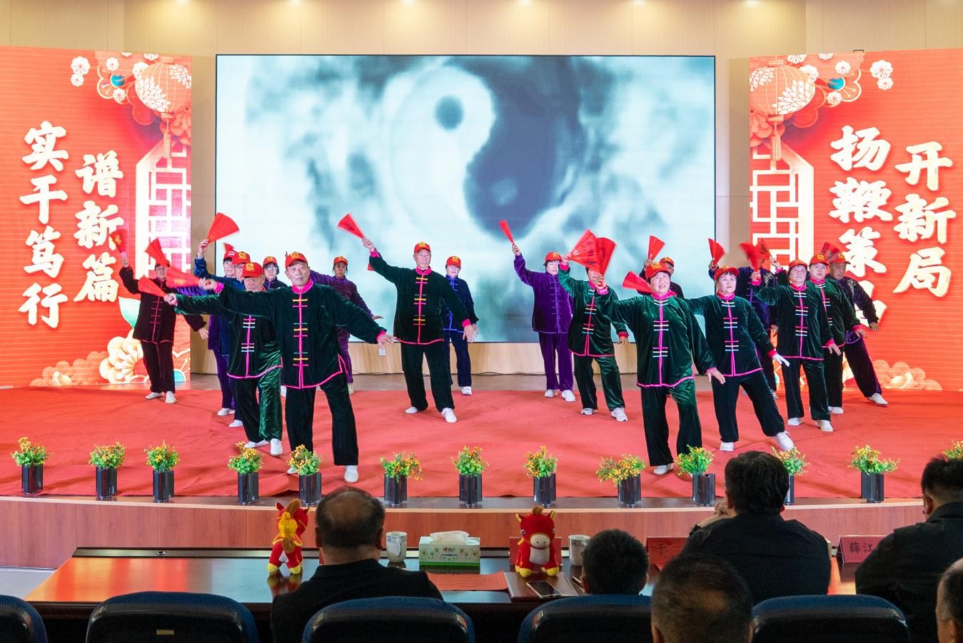镇老体协表演的《花样太极扇》以压轴姿态惊艳亮相。表演者身着统一服饰,精神抖擞地步入舞台,伴随着悠扬舒缓的背景音乐,手持太极扇的动作刚柔并济、行云流水,融入舞蹈的灵动飘逸,舒展优美。扇随身动、身与扇合,开合转承间尽显太极韵味,彩扇翻飞时宛如彩蝶起舞,将太极文化的博大精深与扇舞的灵动之美完美融合,以“老骥伏枥、志在千里”的精神风貌感染带动全场,为“奋起正当时”凝聚起坚实的“银发力量”,赢得现场观众阵阵掌声与一致好评。