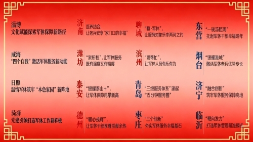 品牌创建激发基层内生动力。印发《关于深入实施军休品牌创建工作的意见》,在全省启动“满意军休”“医养结合”“文化军休”等八大品牌创建探索。各地因地制宜打造特色服务模式,青岛、东营构建“15分钟服务圈”,淄博、济宁创新军休保障路径,济南、潍坊以精准服务提升军休干部幸福感,枣庄、德州引入社会资源夯实服务根基,烟台、泰安、聊城激活军休干部专长助力经济社会发展,日照、菏泽以党建引领打造军休工作新样板,临沂、滨州靶向发力构建精准服务管理模式,形成百花齐放的良好工作格局。