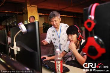 2014年8月5日,四川省泸州市龙马潭区小市街道合道街社区的义务老年网吧监督队的队员在某网吧内巡查。