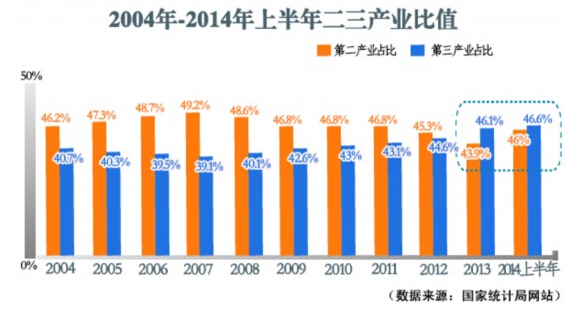 中国经济网通过梳理历年数据发现,从2013年开始,我国第三产业增加值占GDP比重达46.1%,首次超过第二产业;而刚刚公布的上半年经济数据显示,第三产业占GDP比重升至46.6%。