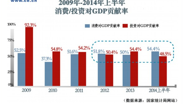 2009年-2014上半年消费和投资对GDP贡献率 郑汉星制图