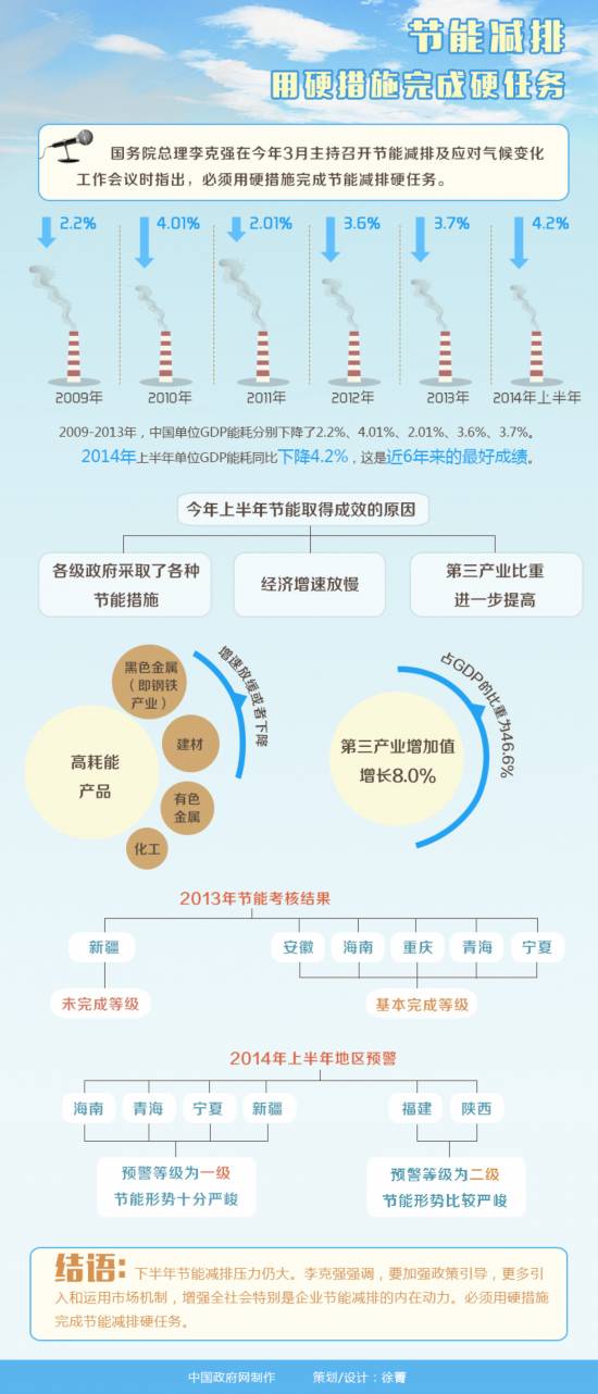 国家统计公报显示,2009-2013年,中国单位GDP能耗分别下降了2.2%、4.01%、2.01%、3.6%、3.7%。国家发改委判断,结合近期开展的各地节能目标完成情况现场评价考核,参考历史数据,如果延续目前态势,预期可实现全年节能减排目标。