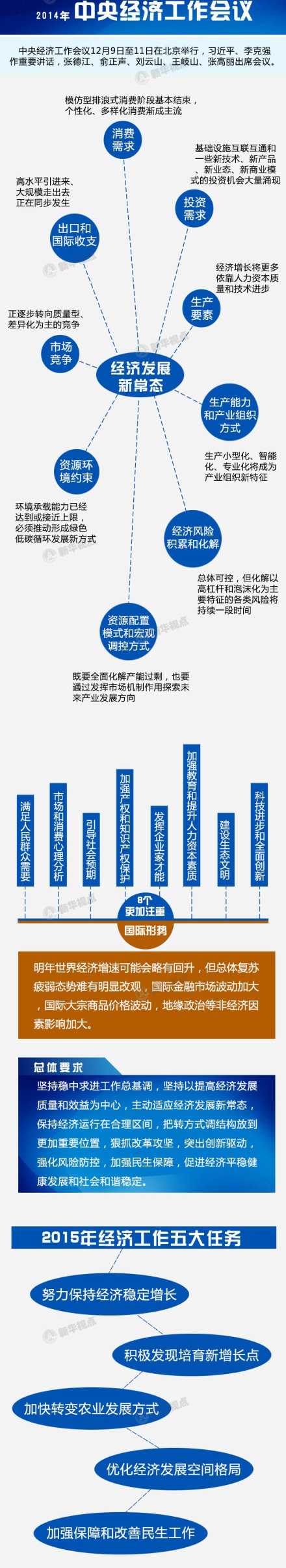 【准确把握经济发展新常态】1、模仿型排浪式消费阶段基本结束,个性化、多样化消费渐成主流;2、基础设施互联互通和一些新技术、新产品、新业态、新商业模式的投资机会大量涌现;3、我国低成本比较优势发生了转化,高水平引进来、大规模走出去正在同步发生;4、新兴产业、服务业、小微企业作用更凸显,生产小型化、智能化、专业化将成产业组织新特征;5、人口老龄化日趋发展,农业富余人口减少,要素规模驱动力减弱,经济增长将更多依靠人力资本质量和技术进步;6、市场竞争逐步转向质量型、差异化为主的竞争;7、环境承载能力已达到或接近上限,必须推动形成绿色低碳循环发展新方式;8、经济风险总体可控,但化解以高杠杆和泡沫化为主要特征的各类风险将持续一段时间;9、既要全面化解产能过剩,也要通过发挥市场机制作用探索未来产业发展方向。