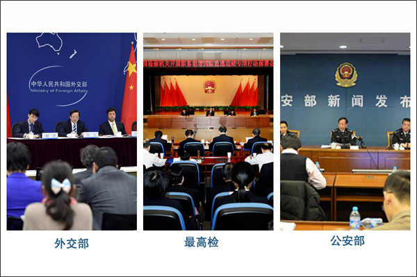 对内协调:在中央反腐败协调小组的统一部署下,各有关部门建立国际追逃追赃工作内部协调机制,组织开展追逃追赃专项行动,多管齐下,综合施策,形成了追逃追赃工作的整体合力。上图为外交部就中国追逃追赃工作举行中外媒体吹风会;最高检召开全国检察机关开展职务犯罪国际追逃追赃专项行动部署会;公安部举行“猎狐2014”专项行动新闻发布会。