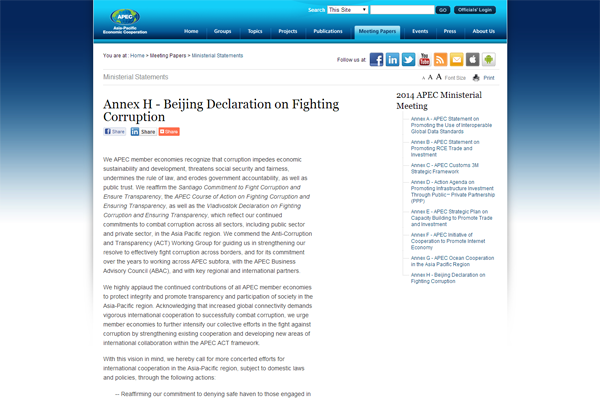 对外合作2:2014年,APEC会议在北京召开,会议通过了《北京反腐败宣言》,成立了亚太经合组织反腐败执法合作网络(ACT-NET),秘书处设在中国监察部。图为APEC官方网站发布的《北京反腐败宣言》。