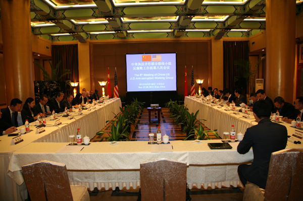 对外合作1:加强《联合国反腐败公约》框架下双边、多边协作,与美国、加拿大、澳大利亚等国建立反腐败执法合作机制。图为2013年在北京召开的中美执法合作联合联络小组(JLG)反腐败工作组第八次会议。