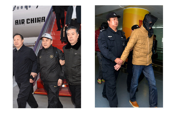 重要成果:“尚有一人在逃,追逃绝不停止”。在中央反腐败协调小组的统一部署下,经过各有关部门共同努力,2014年,共追逃500多人,追赃30多亿元,对腐败分子形成了强大震慑。左图为外逃美国的辽宁省凤城市委原书记王国强(前排中)回国投案自首;右图为公安部“猎狐2014”专项行动将犯罪嫌疑人押解回国。