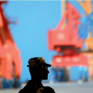 2015年5月11日,在巴基斯坦安保人员护卫下的瓜达尔港码头