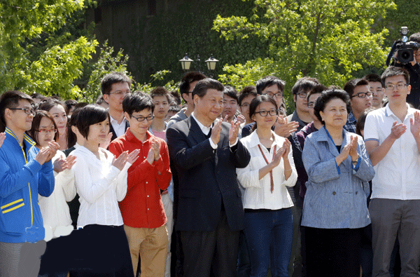 2014年5月4日,中共中央总书记、国家主席、中央军委主席习近平在北京大学考察。这是习近平在校园观看北大师生纪念五四运动95周年青春诗会。新华社记者鞠鹏摄