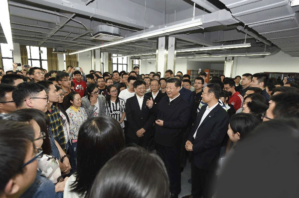 2016年4月24日至27日,中共中央总书记、国家主席、中央军委主席习近平在安徽调研。这是4月26日下午,习近平在中国科技大学图书馆与正在上自习的学生们亲切交谈。 新华社记者李学仁摄