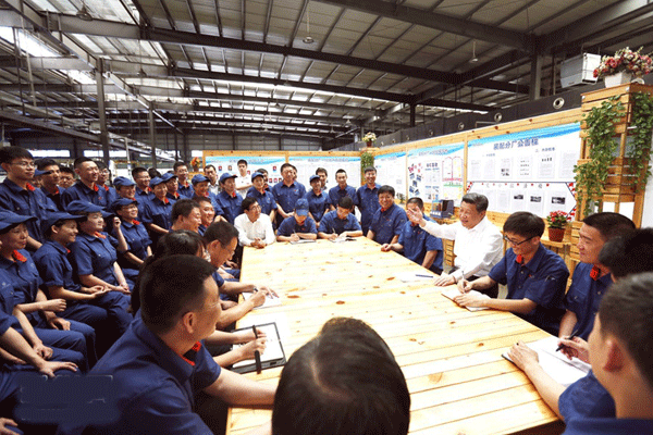 2015年7月17日,习近平在吉林东北工业集团长春一东离合器股份有限公司的车间班组园地同职工座谈。新华社记者 鞠鹏 摄