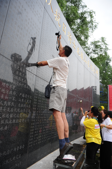 吕小琨,60岁,来自广东,此次前来是为了他的父母亲。他说,纪念碑的建立给了自己一个怀念的地方,他也会永远记得父亲给他说的——要感谢山东人民。站在梯子上跷起脚尖,让他终于拍摄到了父亲的名字。