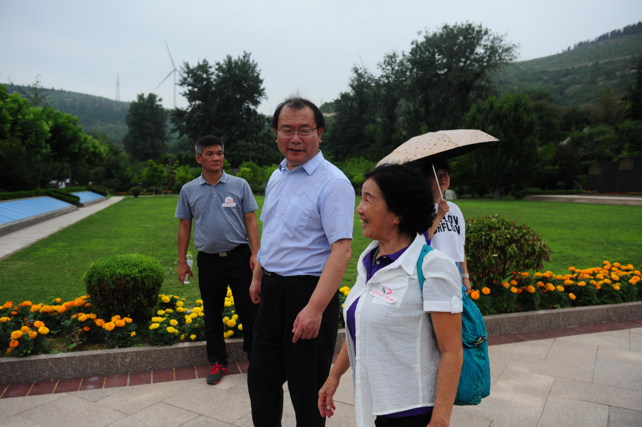 山东省委老干部局副局长吕德义与东江纵队后代黄建和交谈。黄建和今年70岁,同此次来访的很多后代一样,她希望将来能带着孩子再来一次,将这种联系传递下去。