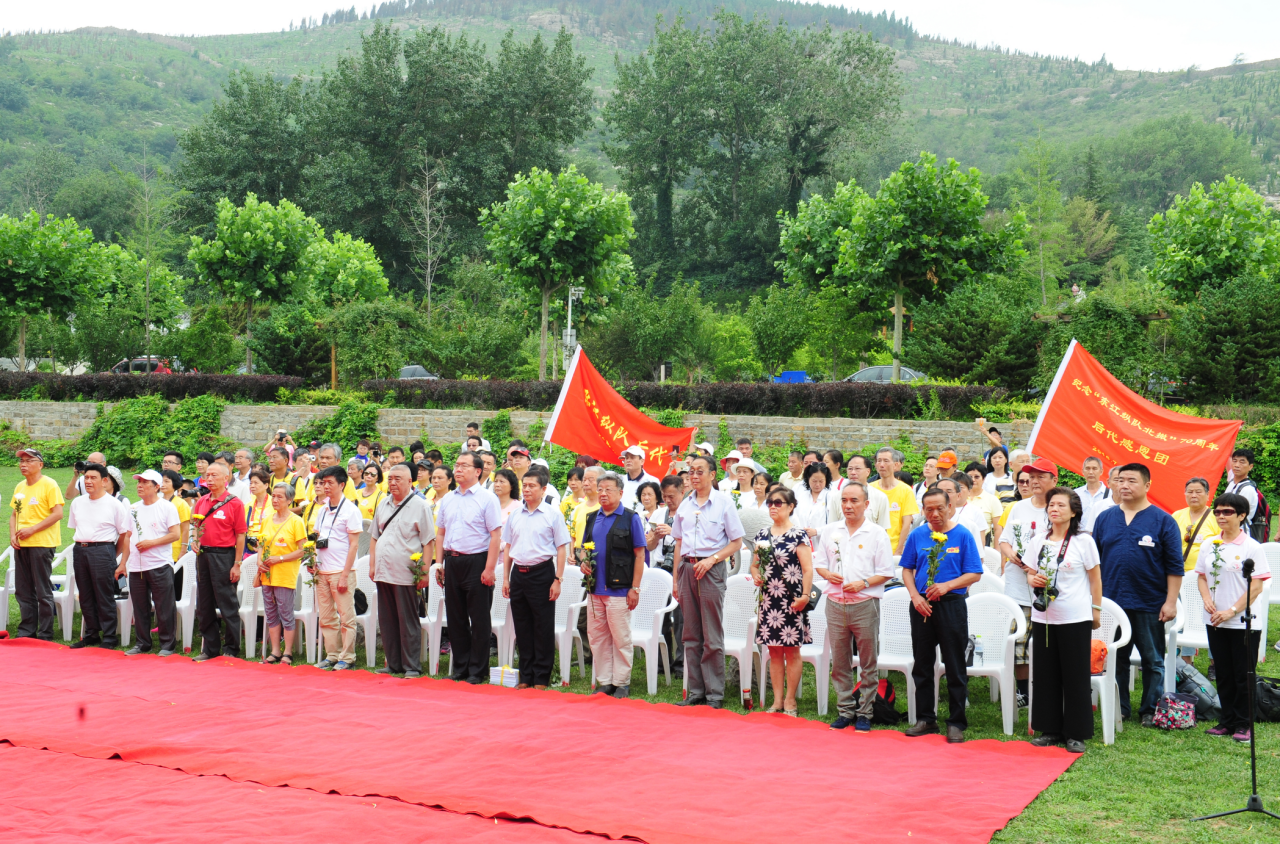 上午九点半纪念活动正式开始,首先进行集体合唱 《北撤进行曲》