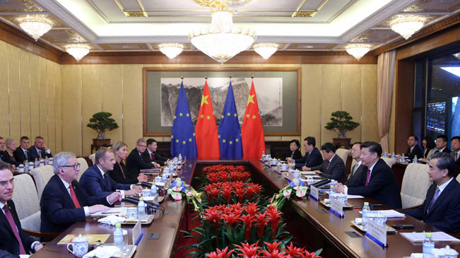 习近平指出,中国欧盟构建和平、增长、改革、文明四大伙伴关系的共识正在落地生根。双方在重大国际事务上保持着战略对话,共同为改善全球经济治理、促进世界可持续发展作出了积极努力,在加强中欧各自发展战略对接方面达成重要共识并付诸行动。中欧双方要不断深化互利共赢的全面战略伙伴关系。