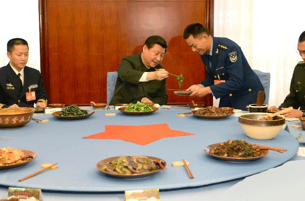 2014年10月31日,中共中央总书记、国家主席、中央军委主席习近平专程来到福建省上杭县古田镇,出席正在这里召开的全军政治工作会议。这是10月31日,习近平同基层会议代表共进午餐、吃“红军饭”。 新华社记者李刚摄