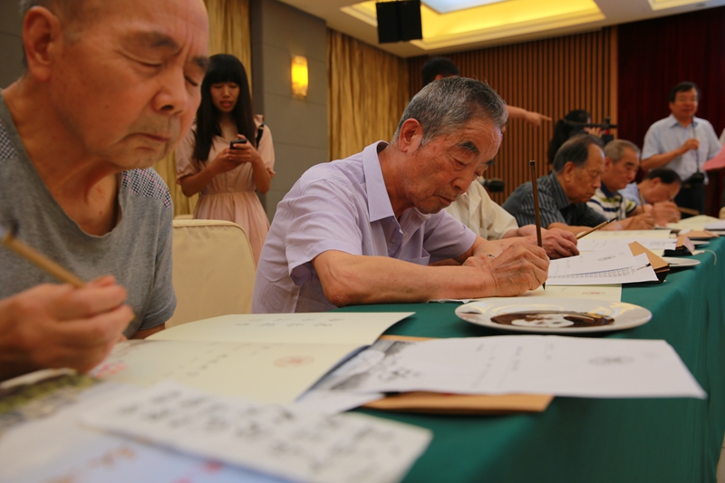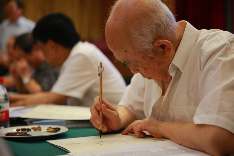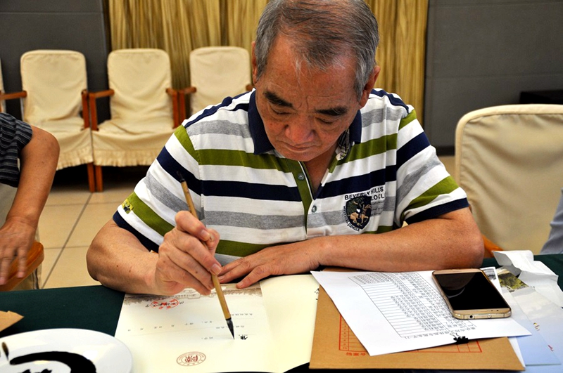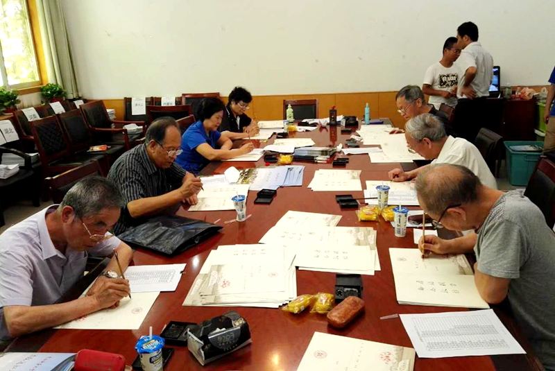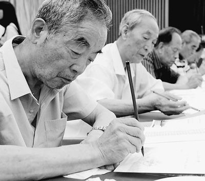 陕西师范大学的吕九如、文占绅、上官养志等12位离退休老教授为新生手写录取通知书的传统已经连续10年。这些老教授们平均年龄70多岁,他们需要5到7天才能完成这项工作。今年,该校今年录取新生4500人左右,每位新生都能收到一份这样的手写录取通知书。下图为老教授们为新生毛笔手写通知书现场。