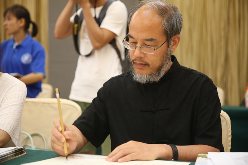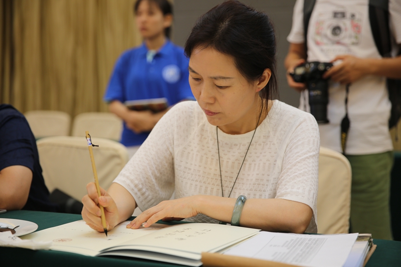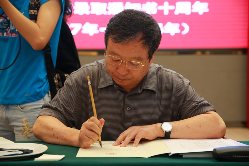 图为陕西师范大学党委书记甘晖为新生书写录取通知书