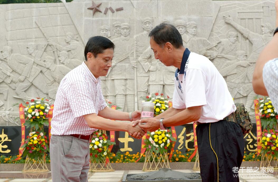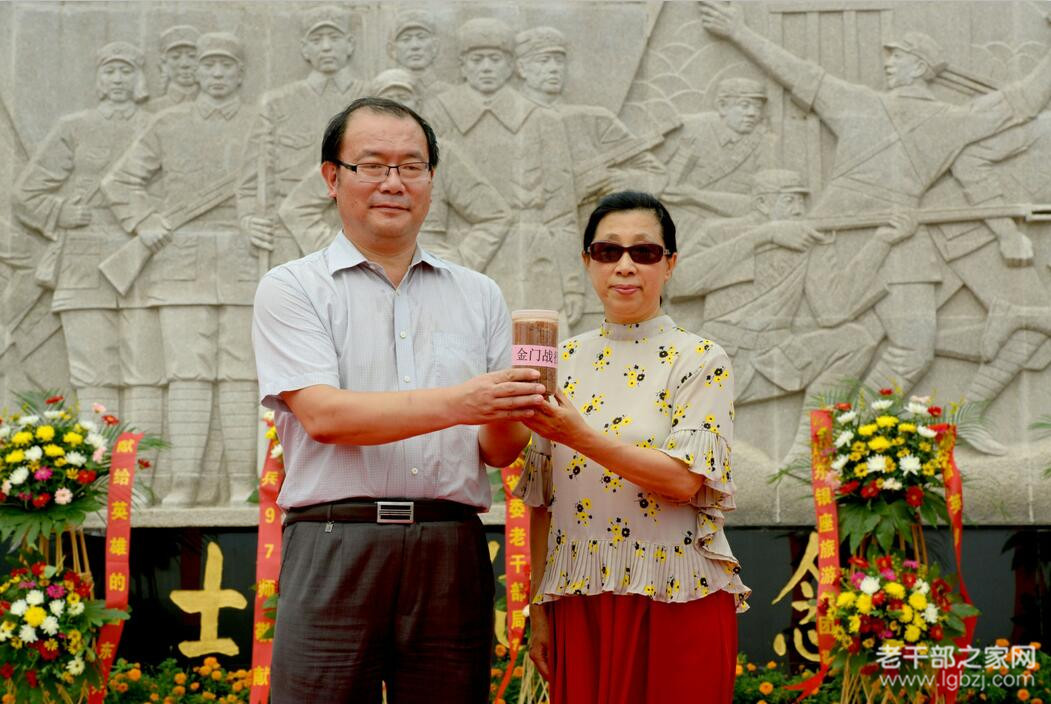 原28军82师师长宋家烈女儿宋晓峰将从金门战役战场遗址取回的土移交给广场,山东省委老干部局副局长吕德义代表省委老干部局接土