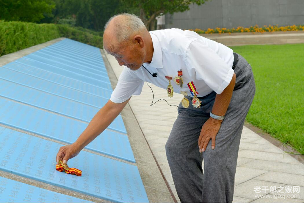 原步兵97师老战士秦龙文将纪念建军90周年奖章放到已故战友的名字前