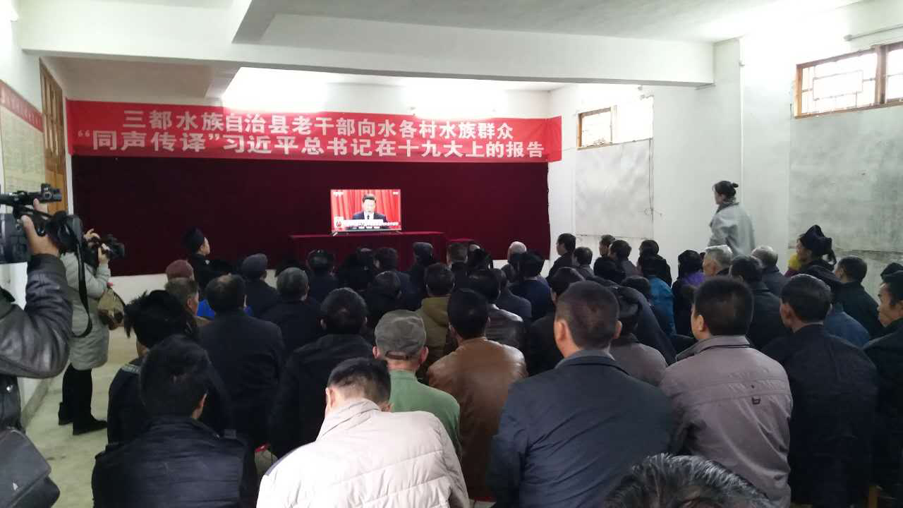 68岁的农民吴伟称赞道:“十八大以来,政策好,农村路通、生产方便,农村变化大,寨寨通公路非常好,我们水族喜迎十九大召开,因为语言不通,用少数民族语言同声翻译让水族同胞更好领会了大会精神。”10月18日上午,三都自治县水书先生、退休老干部杨秀龙来到黔南州三都水族自治县九阡镇水各村,在卯文化水族陈列馆为150余名正在收看党的十九大开幕会电视直播的水族父老乡亲做同步翻译。电视直播结束,村民们久久不愿离去。76岁的村民吴敬文说:“总书记的报告,为未来规划了一个长远的蓝图,让老百姓看到了长远的目标、未来的希望,相信伟大复兴的中国梦一定能够实现。”