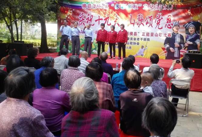 南宁市横县以“多彩金秋”文化活动为平台,于11月3日在横州公园举行离退休干部“多彩金秋”正能量山歌比赛,老同志们以对唱山歌的形式赞颂十九大、宣传十九大,深受当地群众欢迎,为学习宣传十九大精神营造了良好氛围。