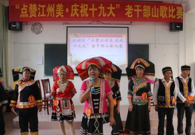 崇左市江州区举办“点赞江州美,庆祝十九大”老干部山歌比赛,老同志山歌手们用“接地气”的民族山歌宣传十九大精神,赞颂十八以来取得的新成就和新变化,号召广大老同志不忘初心、牢记使命,为实现中华民族伟大复兴的中国梦作出应有贡献。