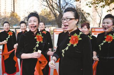 11月26日,河北省廊坊市广阳区康乐社区老年文体队表演群口快板《祖国阔步新时代》,宣传党的十九大精神。为推动党的十九大精神进社区,该社区9支文体队伍,800余人积极参与,创作出一批以党的十九大精神为主题的原创作品。