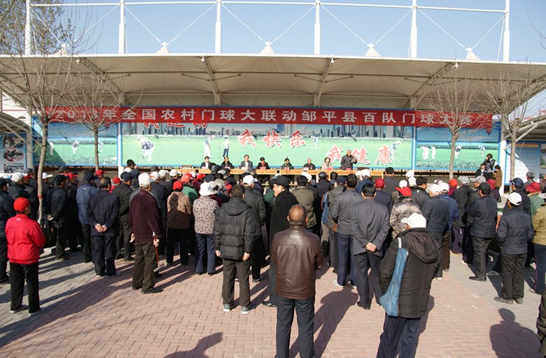 为了深入贯彻落实《全民健身纲要》和《全民健身计划》,广泛开展全民健身运动,统筹城乡门球活动协调发展。2013年4月9日,在“邹平县门球运动中心” 隆重举行《全国农村门球大联动邹平县“百队”门球大赛》。本次比赛由邹平县老年人体育协会主办,中共韩店镇党委政府、邹平县门球工委协办。4月9日上午举行了隆重的开幕式。中共邹平县委常委、副县长尹艳玲,邹平县人大常委会副主任朱秀英,邹平县政协副主席潘晓霞,邹平县老年人体育协会名誉主席陈元德、邹平县老年人体育协会主席程作通,邹平县老年人体育协会副主席韩祥水,中共韩店镇党委书记刘长海出席开幕式。程作通同志主持开幕式,韩祥水同志致开幕词,尹艳玲同志宣布大赛开幕。