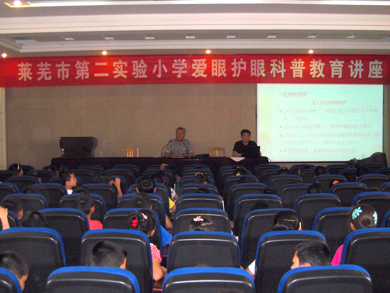 为迎接6月6日第十八届“全国爱眼日”的到来,近日,市关工委联合心视界眼健康中心举办的爱眼护眼科普教育讲座先后在市第二实验小学、钢城区新兴路学校开讲。活动邀请莱钢医院原副院长、眼科主任医师黄尔贤教授为500多名小学生作了专题报告。黄教授从我国青少年近视眼的现状出发,详细讲解了近视眼的成因、危害及预防措施,教育同学们要从小树立保护眼睛的意识,注意科学用眼,养成良好的用眼习惯。活动中,还向陈毅中学、艾山中心小学等学校的中小学生及家长发放《莱芜市视力健康档案及爱眼科普手册》1万余份。
