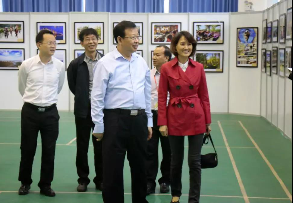 ▲图为自治区副主席李彬(前排左一)在自治区党委组织部副部长、老干部局局长曾艳(前排右一)的陪同下参观书画摄影作品展。