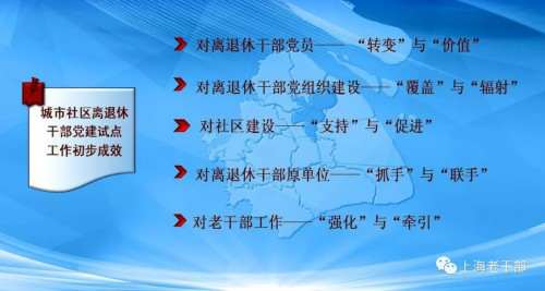 加强工作保障,发挥组织优势。调整配备从事社区离退休干部党建工作的人员力量,提供必要的支持。试点工作取得的初步成效主要有:对广大离退休干部党员:参加组织生活和学习活动更加便捷,从12天增加到365天,多了一个“自己的家”、多了一重学习、多了一种身份、多了一份关心、多了一条实现价值的途径;对离退休干部党组织建设:推进了其在基层社区的组织覆盖,将政治功能和服务功能向社区辐射;对社区建设:提供了宝贵的专业人才和智力支持,促进了社区党建和社会治理;对离退休干部原单位:延长了关爱照顾老同志的手臂,能与社区党组织联手提高离退休干部党建工作质量;对老干部工作:强化了新时代老干部工作的主责主业,牵引带动提升了“四个就近”工作的能级。