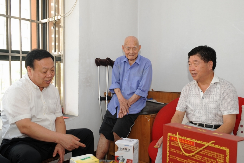 随后,谢玉堂一行到老退伍军人杨书廷家走访慰问,给老人送上慰问品和慰问金。杨书廷老人参加过抗日战争、解放战争和抗美援朝战争,战斗足迹踏遍大半个中国,他向大家介绍了塔山阻击战和入朝参战情况。谢玉堂对老人在革命战争时期做出的积极贡献给予高度评价,并叮嘱老人子女一定要照顾好老人,让老人安享天伦之乐。