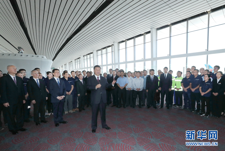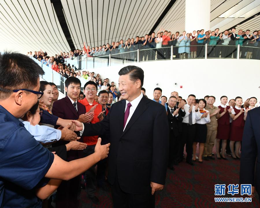 投运仪式结束后,习近平来到机场国际出发大厅,看望参与机场建设和运营的工作人员代表。习近平同大家一一握手,代表党中央向大家并向所有参与机场规划、建设、运营的同志们表示热烈的祝贺和节日的问候。习近平指出,大兴国际机场建设标准高、建设工期紧、施工难度大,全体建设者辛勤劳动、共同努力,高质量地完成了任务,把大兴国际机场打造成为精品工程、样板工程、平安工程、廉洁工程,向党和人民交上了一份令人满意的答卷!
