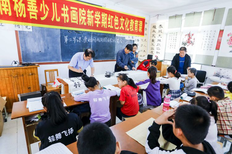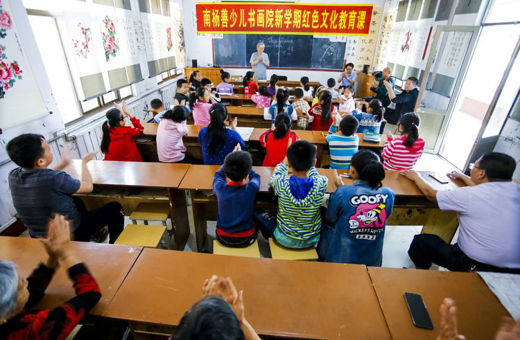 为庆祝新中国70年华诞,9月20日,潍坊临朐县老干部书画研究会在临朐县南杨善少儿书画院举办新学期红色文化教育课暨“我爱祖国、我向国旗敬礼”书画笔会。
