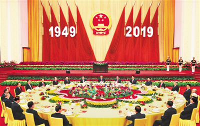 在喜庆欢快的乐曲声中,中外宾朋举杯共贺中华人民共和国成立70周年,祝福中国繁荣富强,祝愿中国同世界各国友谊长青,共创幸福美好未来。
