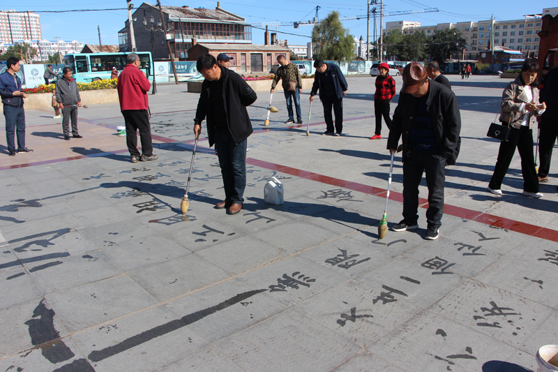 参加活动的现场人员大都是已经退休的老年爱好者,年老心不老,白首奉初心,老年爱好者们即兴创作,各展所长,以地为纸,清水为墨,手提一杆大笔,弓腰悬臂,提神凝器,用隶书、草书、楷书等多种字体在地面上书写着“热烈庆祝新中国成立70周年”“赞美祖国、讴歌新时代”“不忘初心、牢记使命”等文字,表达了浓浓的爱国之情。书法爱好者们用自己的热情感染秋风高阳,用自己的长笔赞颂祖国70周年华诞,将对祖国的无限热爱融入到书画中去。一笔一划,遒劲有力,豪迈大气,让人赏心悦目赢得了驻足观看的各机关单位干部和社区群众的声声赞叹。