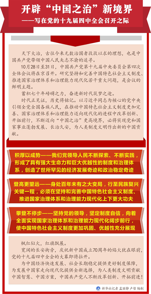 10月28日至31日,中国共产党第十九届中央委员会第四次全体会议将在京召开。研究坚持和完善中国特色社会主义制度、推进国家治理体系和治理能力现代化若干重大问题,是会议的鲜明主题。