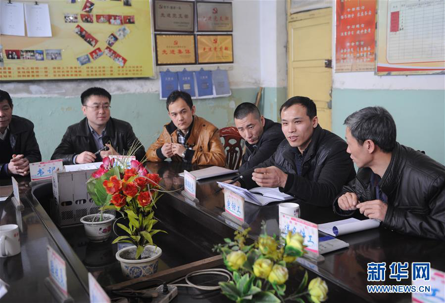 全国人大代表、山西焦煤西山煤电杜儿坪煤矿的董林(右二)在和工友们座谈(2013年2月26日摄)。新华社记者 燕雁 摄