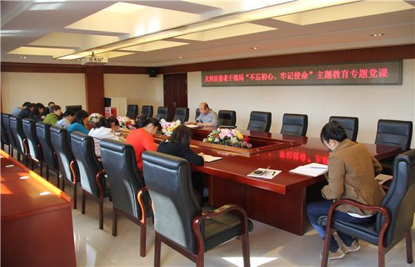 按照区委“不忘初心、牢记使命”主题教育整体部署和区委老干部局开展“不忘初心、牢记使命”主题教育总体安排,10月28日和10月29日下午,北京市大兴区委老干部局副局长宋新影、赵礼刚同志分别以“不忘初心、牢记使命,做好新时代老干部工作”和“不忘初心、牢记使命,发挥先锋模范作用,筑牢基层战斗堡垒”为题,为分管科室在职党员讲授党课。