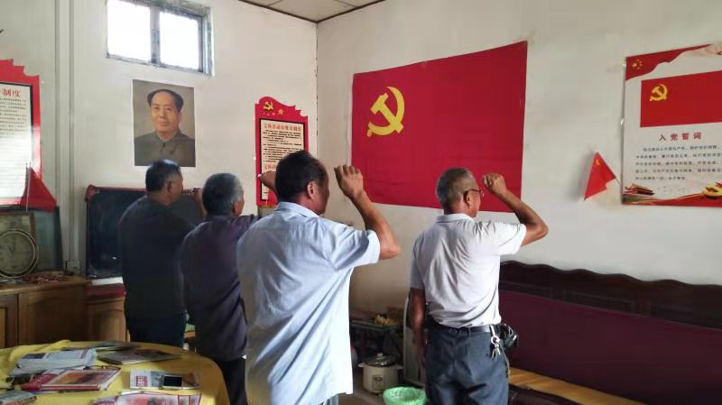 2019年10月1日,临沭县蛟龙镇后蛟龙村胡顺建家,四名离退休党员干部齐聚一堂,过了一次难忘的组织生活——收看庆祝新中国成立70周年庆祝大会、发表感言、举起右手面对党旗重温入党誓词……