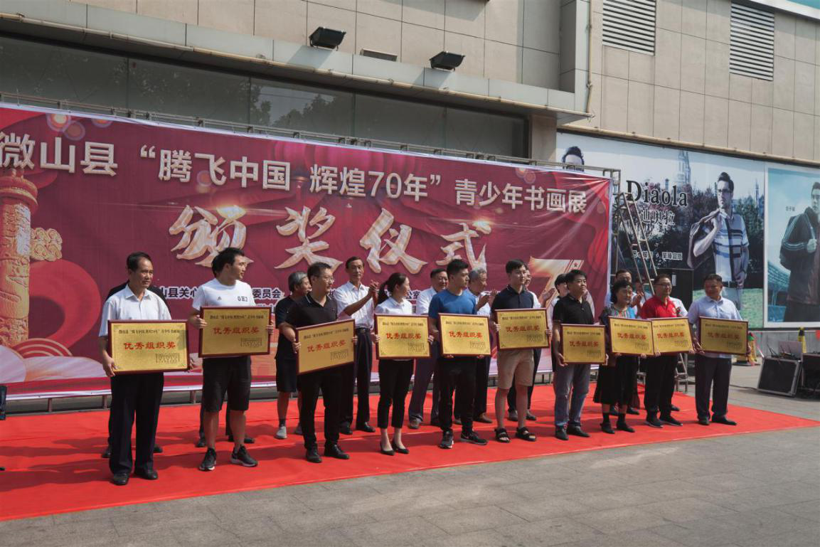 获奖作品展示和颁奖仪式在新供销大厦广场举行。县关工委主任马祥秋,常务副主任、秘书长蔡成全,副主任于恒启,县委组织部副部长、老干部局局长、县关工委副主任殷昭浩,县委宣传部副部长张颖梦,团县委副书记华宏卿,县教体局副局长陈庆明,以及县书协、美协、供销大厦相关负责同志出席仪式并为获奖集体和个人颁奖。县委老干部局副局长杜高新主持活动。本次书画展共征集书画作品500余幅,经专家评审,最后评出优秀组织奖10名,书法类优秀奖158名,绘画类优秀奖35名。