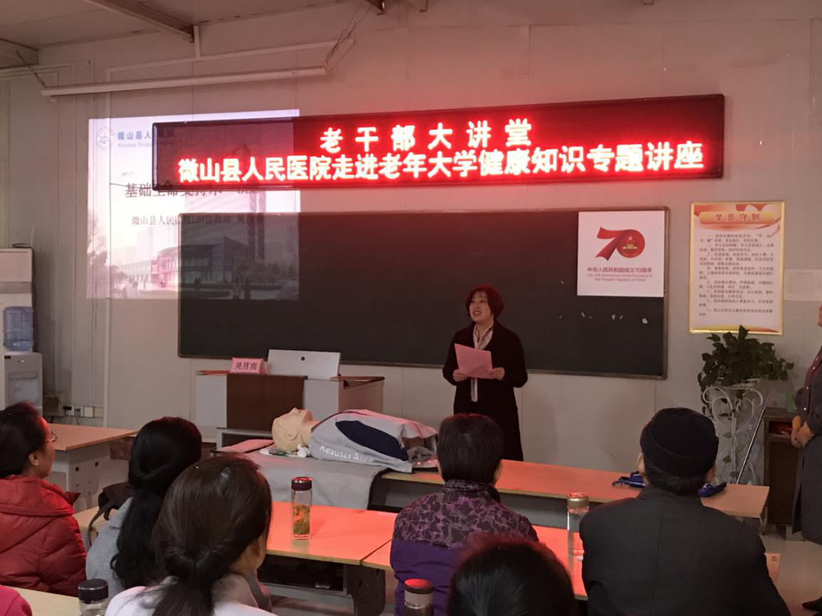 为进一步增强老干部、老年学员的安全意识和工作人员的责任意识,提高应急救援技能。11月18日上午9点,济宁微山老年大学多媒体教室成功举办老干部大讲堂活动。此次老干部大讲堂邀请了微山县人民医院急救站护士长吴月宾作专题健康知识讲座。
