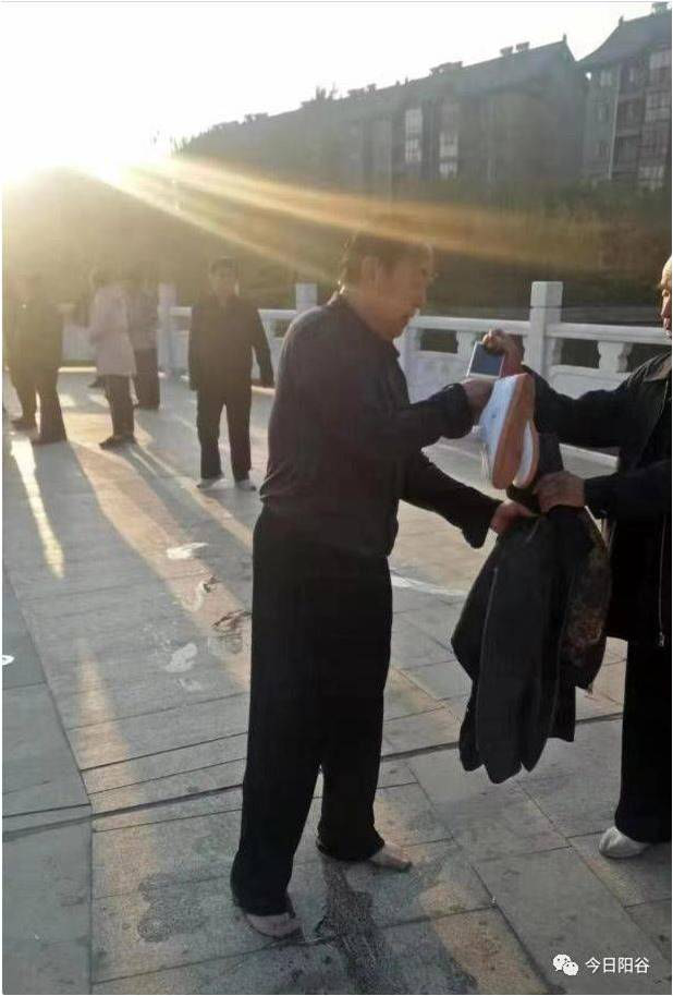 2019年11月4日,深秋时令的早晨,美丽的紫汇湖清幽静谧。山东聊城市阳谷县退休干部郭守贵如往常一样,在湖畔晨练。晨练结束后,郭守贵又来到环湖廊桥与拳友朱老师继续切磋太极拳法。