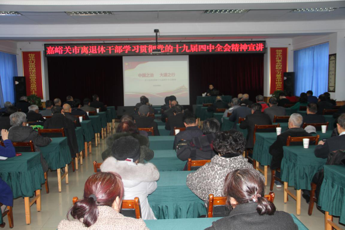 11月27日,甘肃省嘉峪关市举办离退休干部党的十九届四中全会精神宣讲报告会。市委讲师团成员张发东为离退休干部们做了《中国之治 大道之行——学习宣传贯彻党的十九届四中全会精神》专题宣讲报告。离退休干部和市委老干部局工作人员共100余人参加报告会。