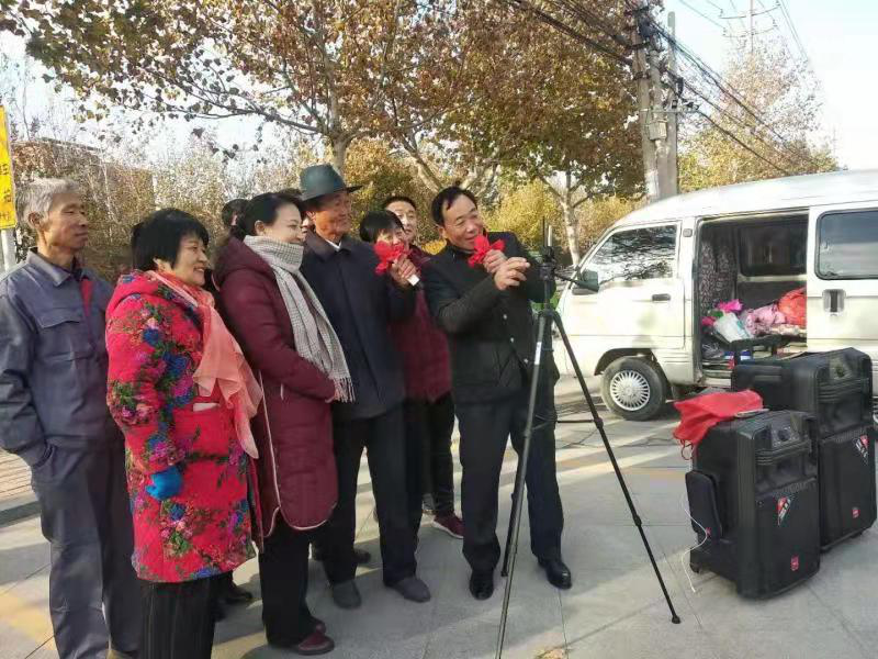 说办就办,2017年5月,于希明开面包车驮着自己购置的音箱、话筒、蓄电池、手机、三脚架,出现在安大广场。设备迅即到位,轻轻几点,三下两下,音箱立刻飞扬起动人心弦的音乐,一首首歌词也随之映现宽屏屏幕,他放声独唱高歌,一首《东方红》引来三四位歌迷;再一首《春天的故事》,就被涌来的歌迷观众围了个严严实实。几位歌迷凑上前跃跃欲唱,他就让出了话筒。1年多下来,他带着熟悉不熟悉的歌迷唱遍了黄河公园、黄河古渡等广场。每到一处,歌迷和观众们也纷纷随他而去。他建立了“歌迷、观众联谊微信群”,到哪演唱会随时通知他们前往演唱、观看。