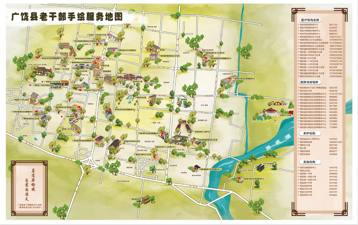广饶县老干部服务中心坚持即知即改,积极争取广饶街道及相关县直部门单位配合,通过实地采集、现场核实等方式摸清医疗机构、党群活动机构、养护机构及信息咨询机构有关信息,编制《老干部手绘服务地图》。目前服务地图已编制完成,小小的一张手绘地图中,内容涵盖了城区文化活动、党群服务、养老服务、老年教育、医疗卫生等场所信息,已印制2000余份,面向全县离退休干部发放,为老干部“四就近”活动提供了有力保障。