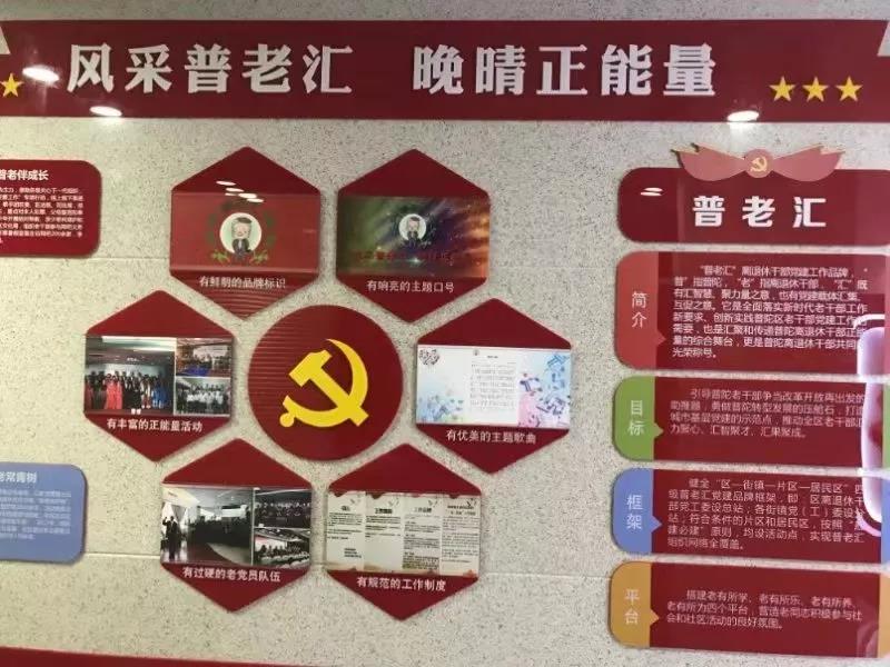 位于风景如画的长风公园畔,建筑面积3600多平米的普陀区老干部活动中心,既是普陀区离退休干部的“全日制”党建阵地,也是老同志的精神乐园。这里有一群“退休不褪色、离岗不离党”的老干部,他们倾情社区,寄情奉献,与时代同脉搏,与党建共命运,集地而居、志趣结缘、助力发展,自发组建成立普老汇,目前共吸纳接收骨干成员800多人,以“风采普老汇,晚晴正能量”为理念,引领带动离退休干部党员融入社区建设和社会治理,为城市基层党建工作添砖加瓦,为党和人民事业增光添彩。