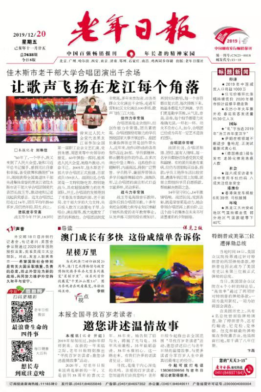 《老年日报》头版头条报道黑龙江佳木斯市老干部大学合唱团先进事迹
